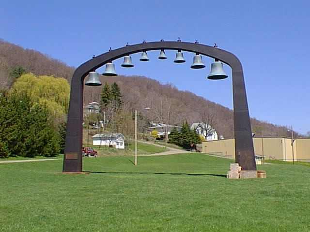 The above pictured tower, located at the corner of Fourth Avenue and Beech Street in Warren supports 3 bells, one above the other. It was erected in 1981 and was designed by Joe DeFrees and fabricated by Bill's Welding Shop, in Warren. A plaque on the base of the tower is a quote from Tennyson: "Ring in the lover of truth and right. Ring in the common love of good." The top bell is 40 1/8 inches in diameter and weighs 1400 pounds. It was purchased from Stockton Sales in Columbus Pa. in 1978. The second bell is 30 1/2 inches in diameter, weighs 600 pounds and was purchased in 1978 from Thomas Carroll who lived on Main Street in Youngsville. The bottom bell is 25 1/2 inches in diameter and weighs 350 pounds. It was purchased in 1979 from Stockton's Sales in Columbus Pa.